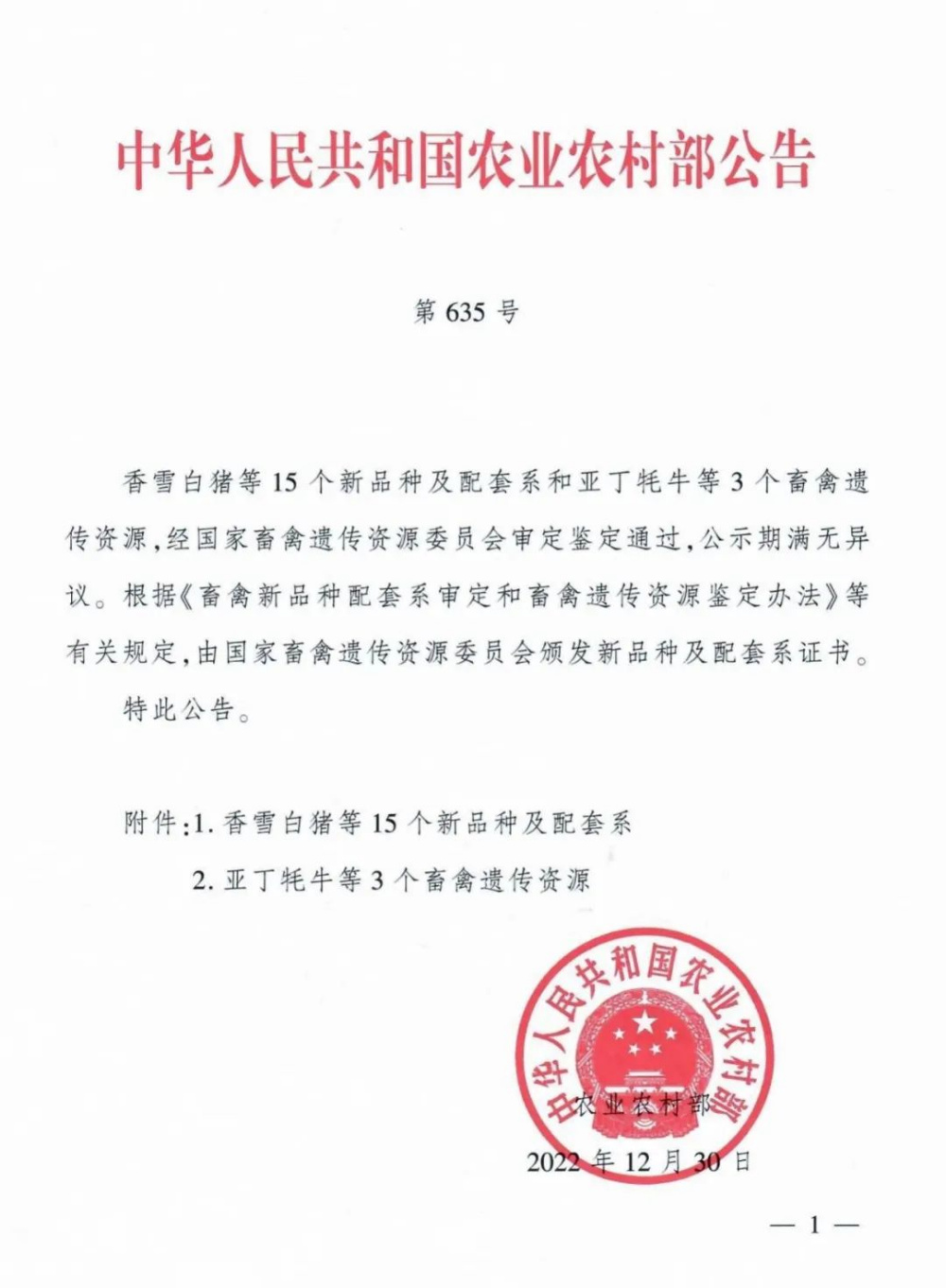 2022年12月30日,農(nóng)業(yè)部發(fā)布了第635號公告:香雪白豬等15個新品種及配套系和3個畜禽遺傳資源,經(jīng)國家畜禽遺傳資源委員會審定鑒定通過!